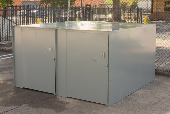 Reinforced 18 gage galvanized high security bike lockers with powder coated finish.
