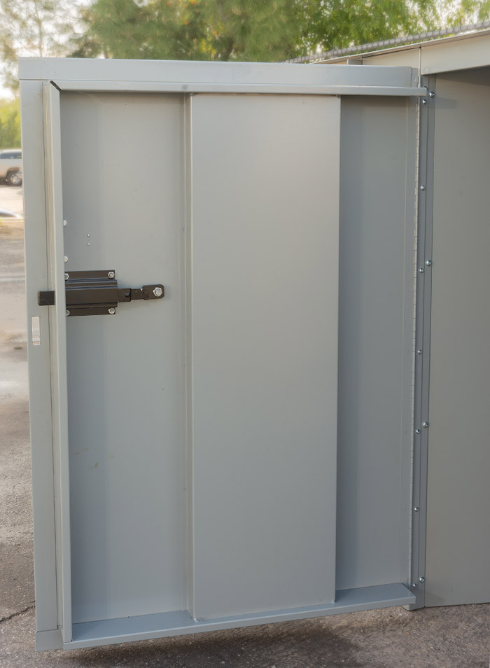 1 inch steel deadbolt latch, not accessible when door is closed. Front section recessed 1 ½" preventing prying against door. Thick loop for padlock projects from the front side and passes through a slot in the door preventing the end panel from being pulled out or lifted. End panel reinforced near the bottom to prevent the end panel from being pushed or pulled out.